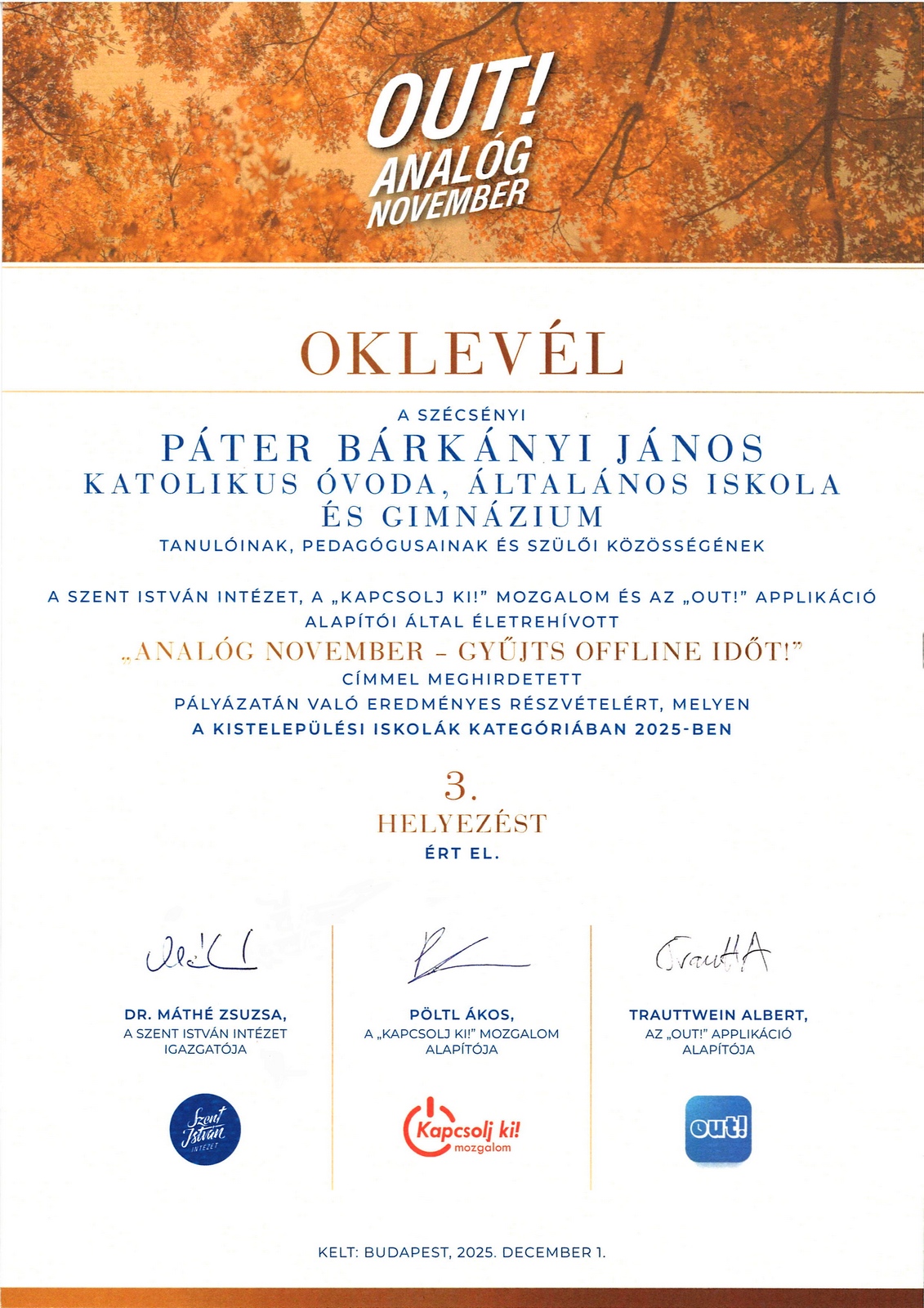 Intézményünk is bekapcsolódott a Szent István Intézet által indított, a „Kapcsolj ki” Mozgalom és az „OUT!” applikáció alapítói által életre hívott Analóg November kihívásba. A digitális önmérsékletre nevelő, játékos program keretében az „OUT!” telefonos alkalmazás segítségével lehetett offline időt gyűjteni.