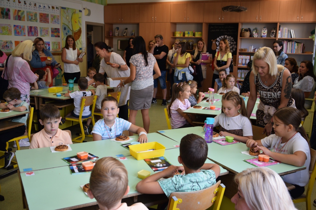 A foglalkozásokat finom tízórai zárta, melyen a gyerekek immár saját tantermeikben a tanító nénik társaságában csillapíthatták finom kakaós csigával és egészséges almalével éhségüket, szomjúságukat.