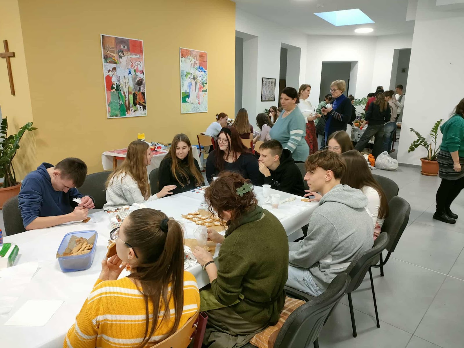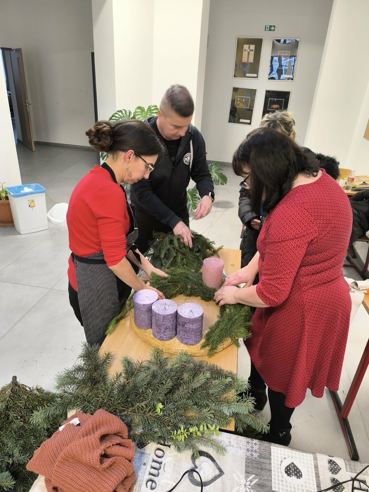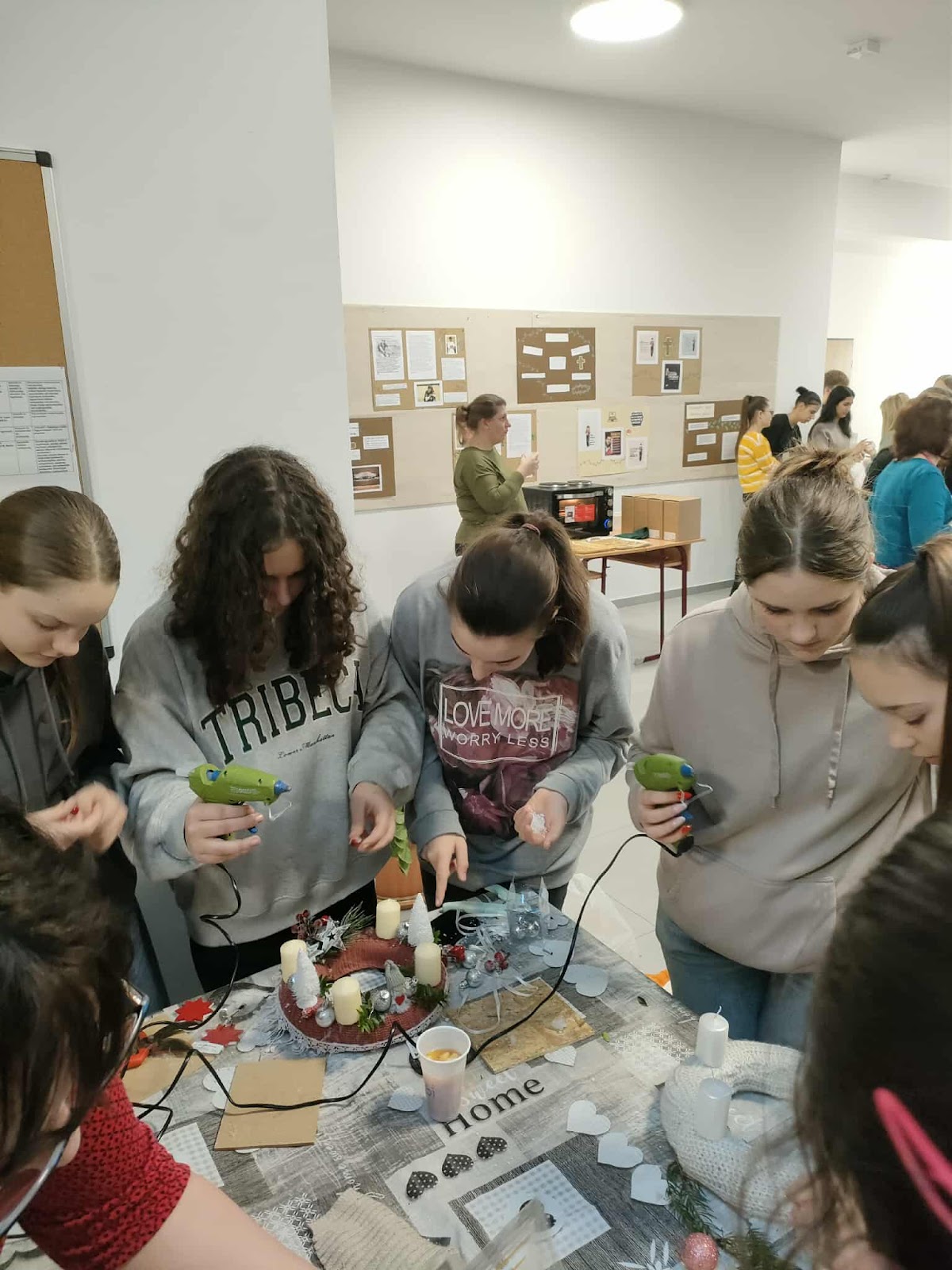 A háttérben folyamatosan szólt a karácsonyi zene, ami még meghittebbé tette az együtt töltött délutánt. A folyosókat betöltötte a frissen sült mézeskalács és a fenyőág illata.