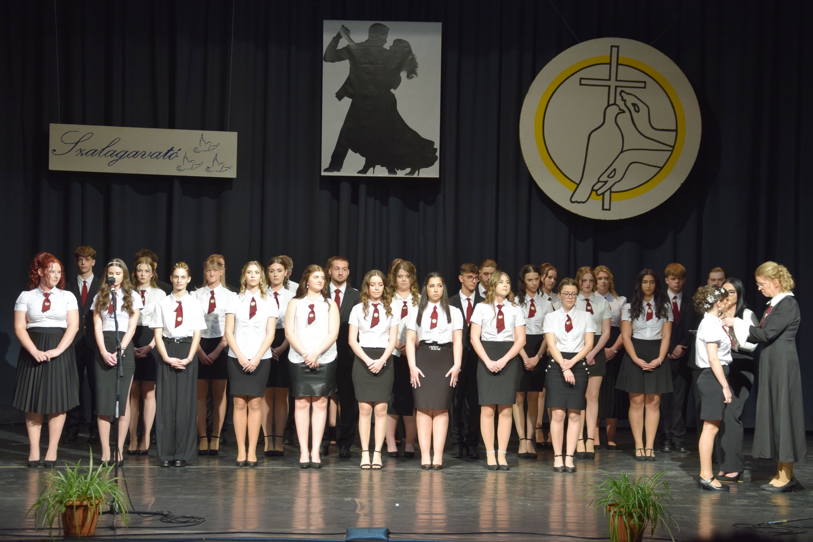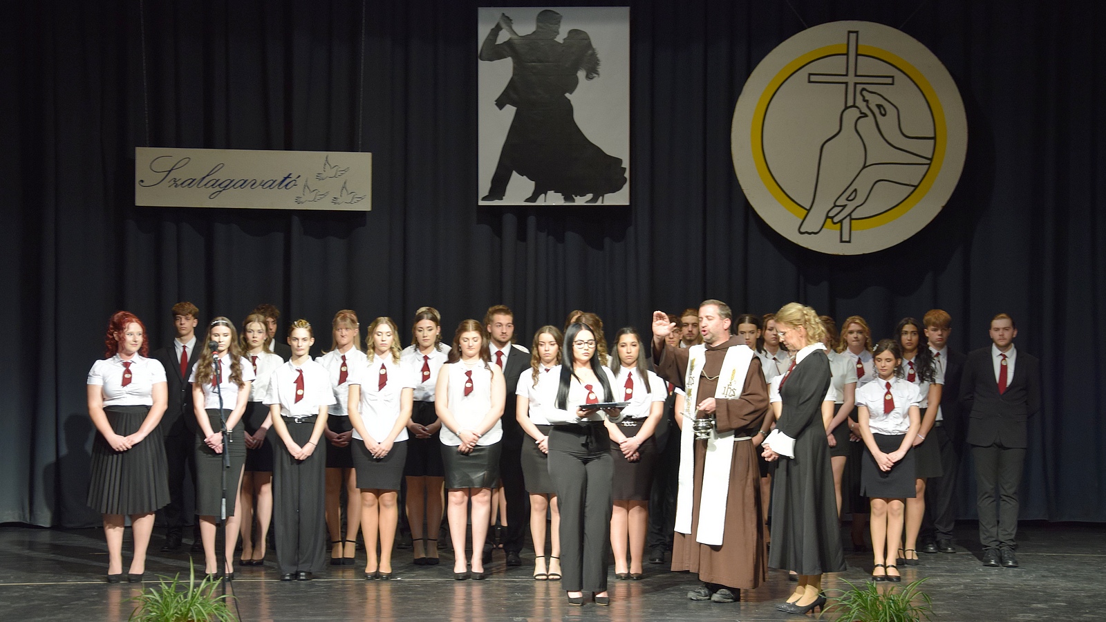 A meghitt pillanatokat Szeles Jázmin Veronika ünnepi beszéde követte, majd elérkezett az est fénypontja: a szalagtűzés. Jób testvér áldása után elsőként az iskola vezetése kapta meg, majd Szmolnik Ágnes osztályfőnök tűzte fel sorra a végzősök mellére a bordó szalagot.