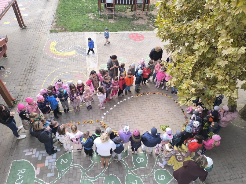 A sok kis részlet végül egy nagy, egységes rózsafüzérré állt össze az óvoda udvarán. A gyermekek büszkén, örömmel figyelték, ahogyan a csoportok által alkotott szemek összekapcsolódnak — ahogyan a közös hit, az egymás iránti szeretet és a közösség ereje is összeköt bennünket. Az elkészült rózsafüzér nemcsak látványos dísze lett az udvarnak, hanem lelki üzenetet is hordoz: emlékeztet minket arra, hogy a teremtett világ kincsei, az őszi termések is Isten ajándékai, amelyekre hálával és örömmel tekinthetünk.