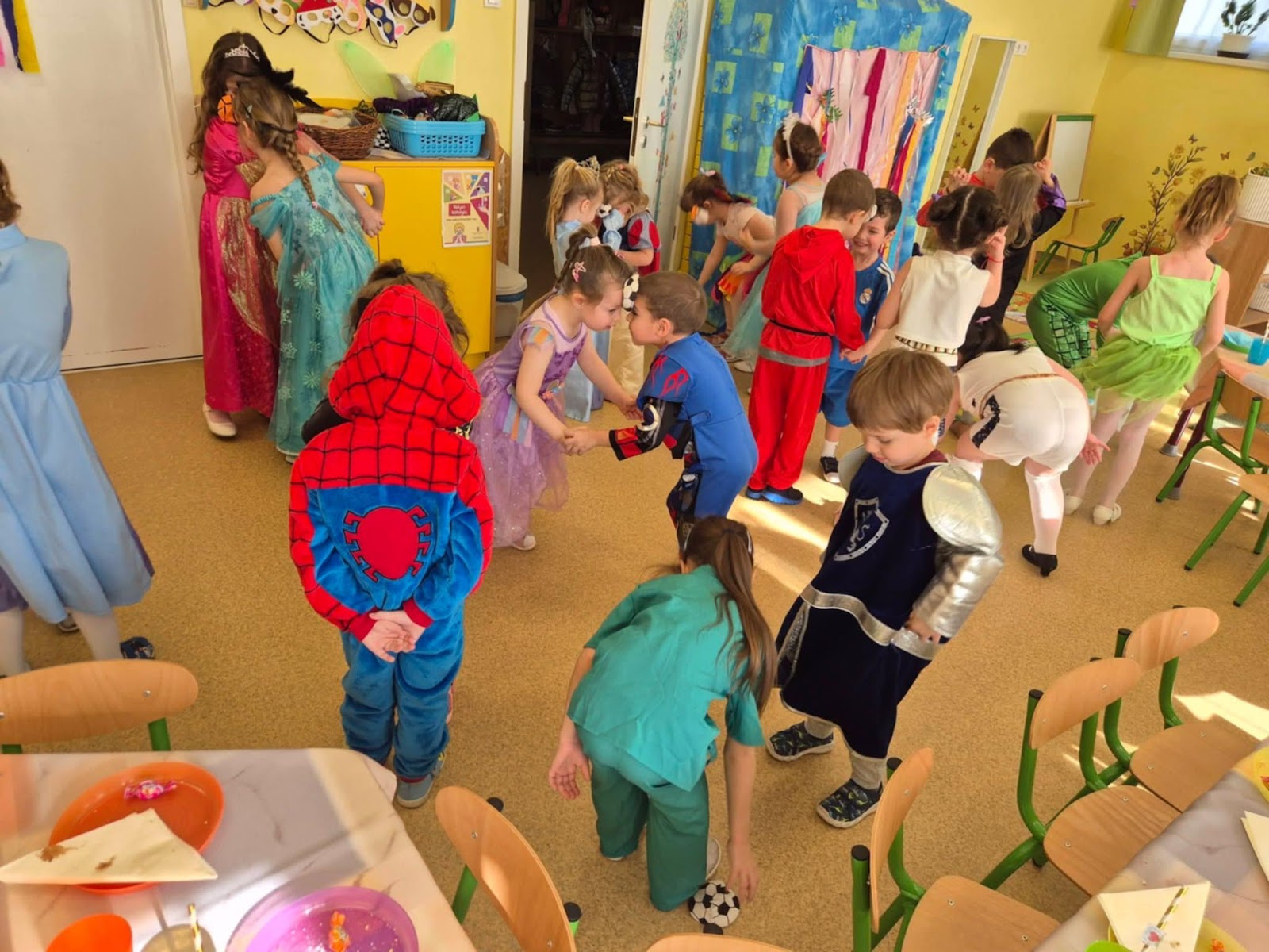 Február 13-án, a farsangi mulatság reggelén az óvoda igazi mesevilággá változott. Érkeztek hercegnők, szuperhősök, állatkák és tűzoltók is. A jelmezes felvonulás során minden gyermek büszkén mutatta be öltözékét a többieknek. A délelőttöt vidám játékok és táncok színesítették. Volt lufitánc, célba dobás és „székfoglaló” is. A mulatság során a finom falatok sem maradhattak el, ahogyan a tánc sem. A farsangi vigasság egyik fénypontja a közös tánc volt, amikor a tornateremben mind a hét csoport együtt járta a vidámabbnál vidámabb táncokat. A hangulatot tovább fokozta a zsákbamacska, amit mindenki boldogan vitt magával haza a nap élményei mellett.